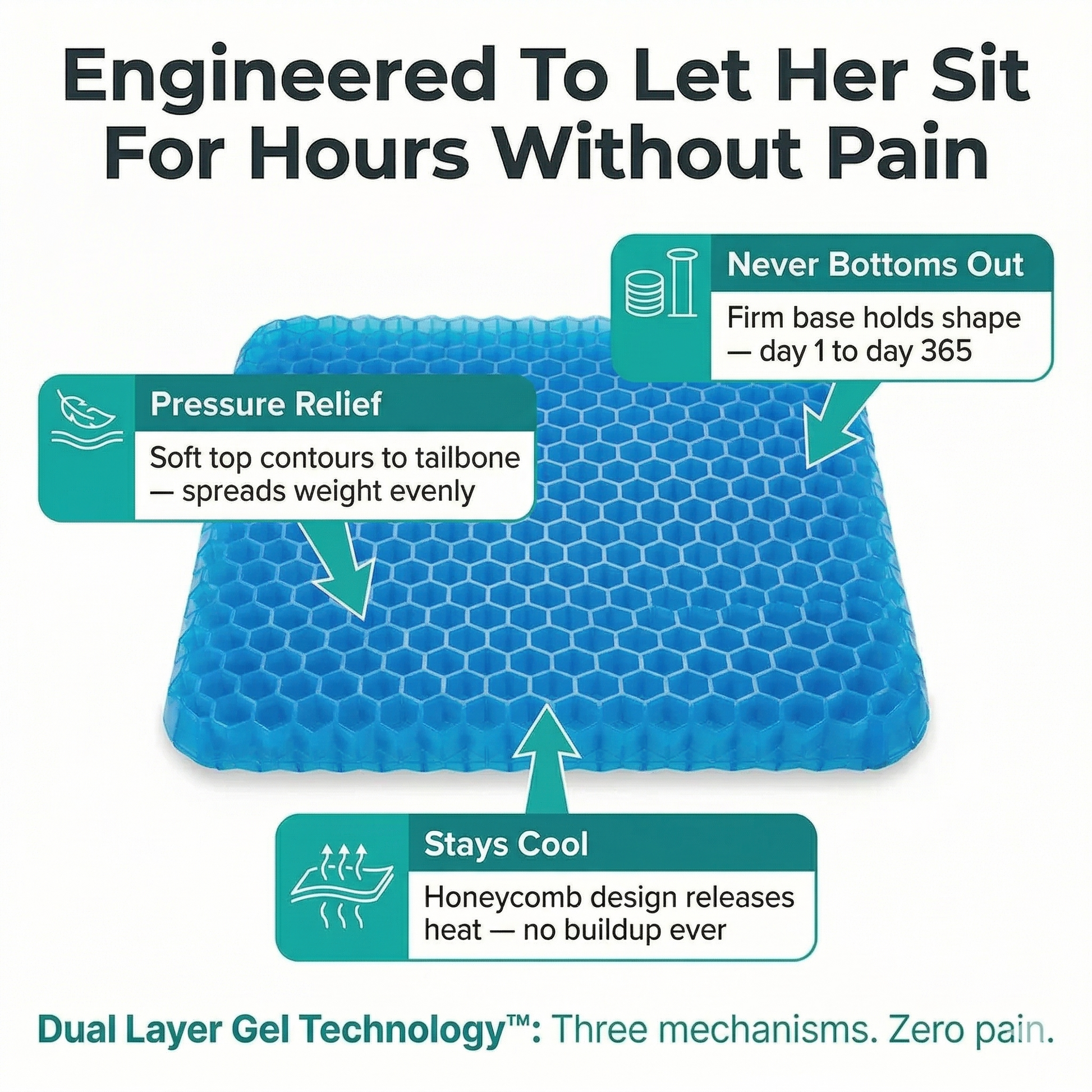 It's not just softer — it's structurally different. The open honeycomb gel creates a suspension zone directly beneath your coccyx and sit bones, eliminating the bone-on-seat contact that causes sciatica and tailbone compression. Softer foam still compresses under you; the gel grid distributes your weight across 500+ independent cells. That's why it works when foam doesn't.